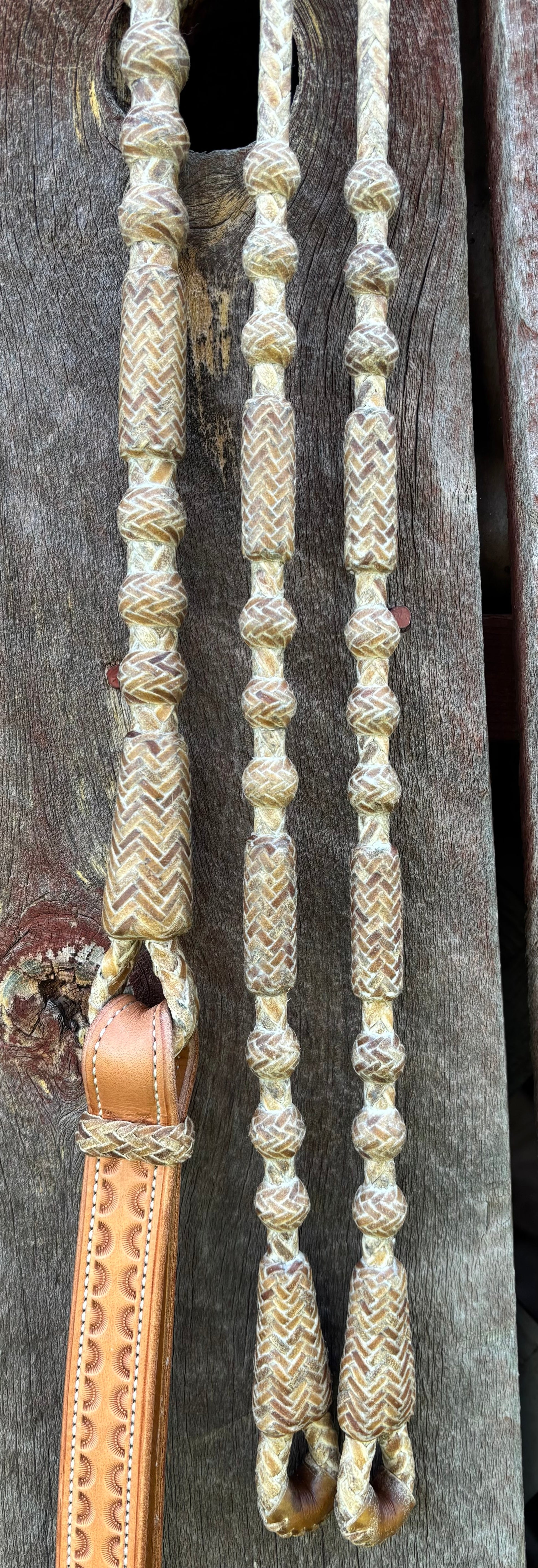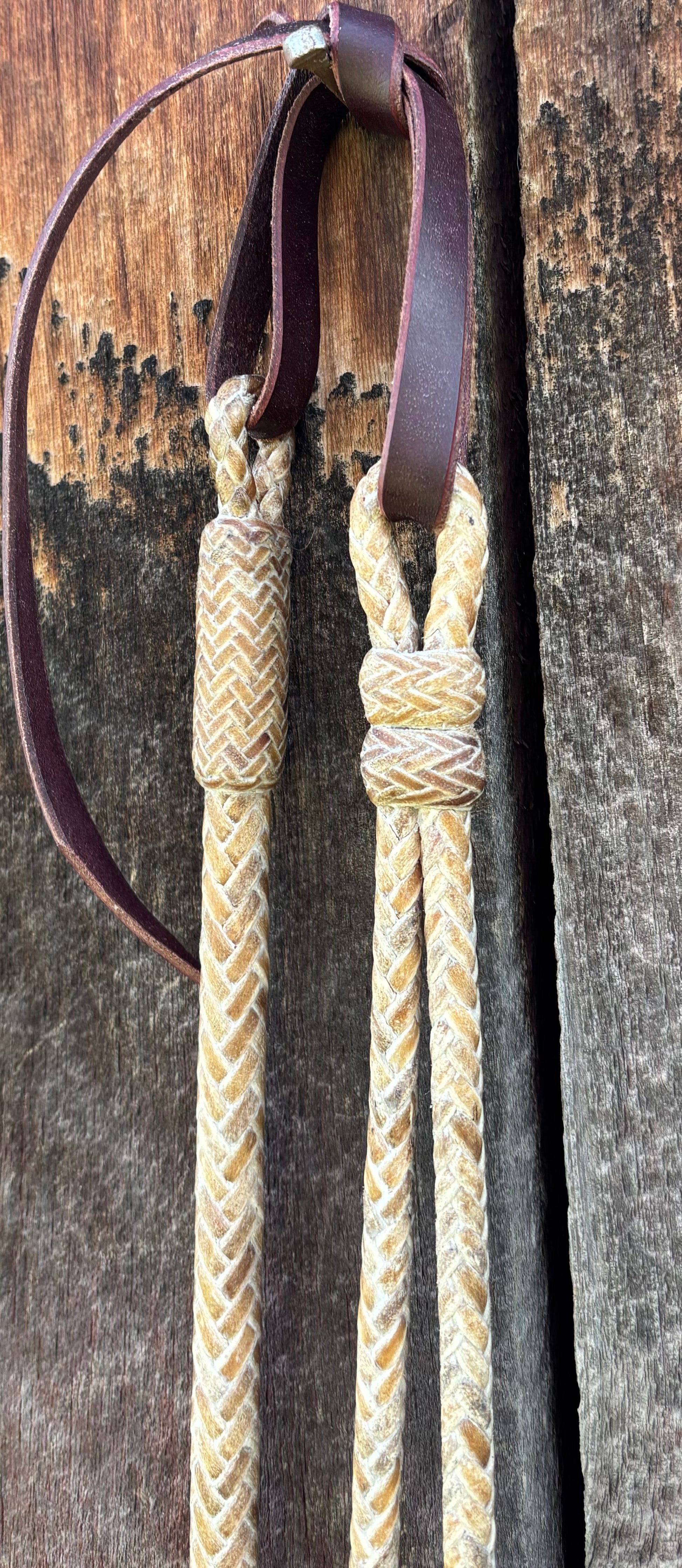 Standard 8 strand reins with 12 strand romal. People have been asking for shorter sets lately, so here they are! Classic reins just a bit shorter for guys and gals that want to rope a lot or are just riding a little shorter necked horse.